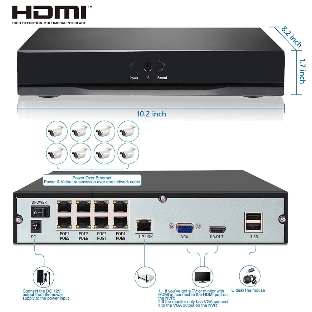 1080P 2MP (1920 x 1080p) PoE 8CH Network HD NVR Video Security Surveillance CCTV System 8CH 1080P P