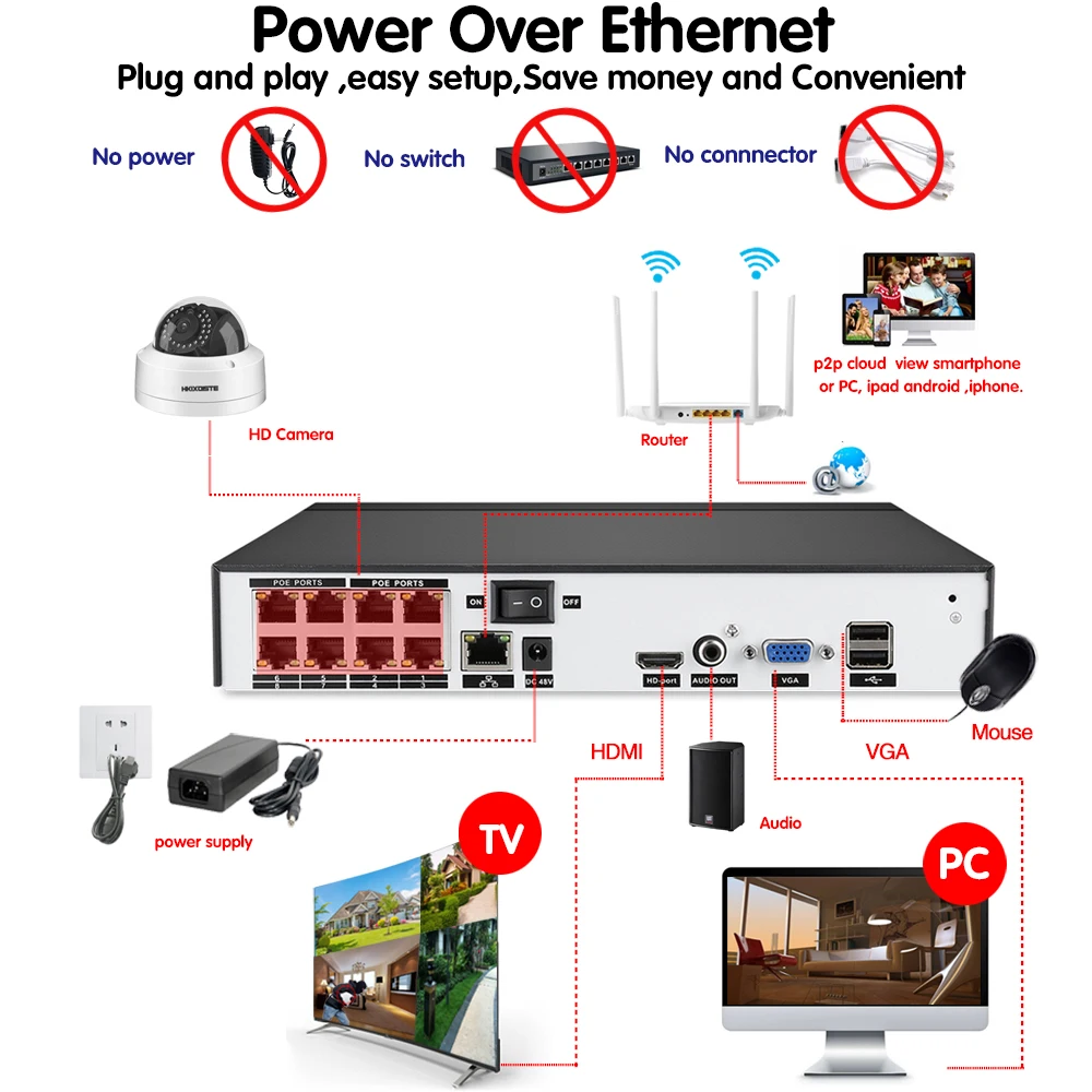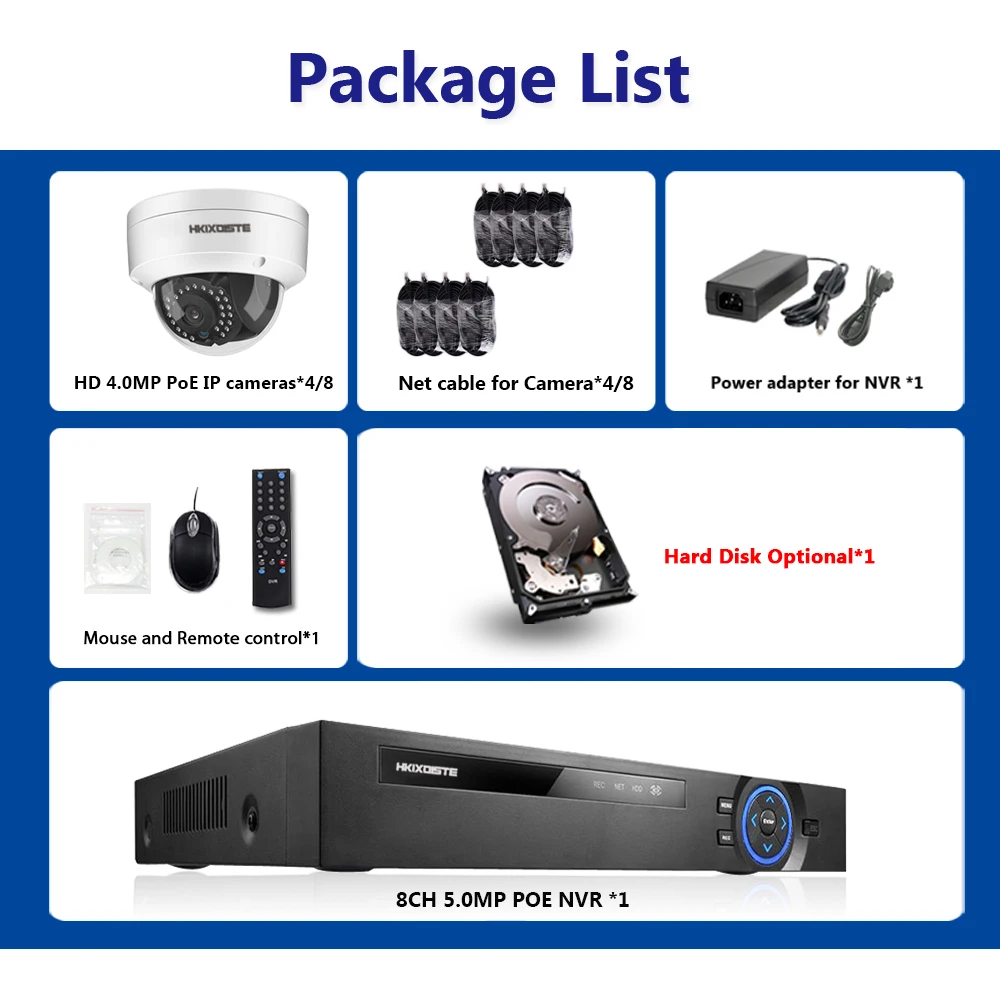 H.265 POE NVR 8CH IP Camera 16CH 5MP System 8pcs 48V Superclear 4MP Security Dome IP Camera kit CCT