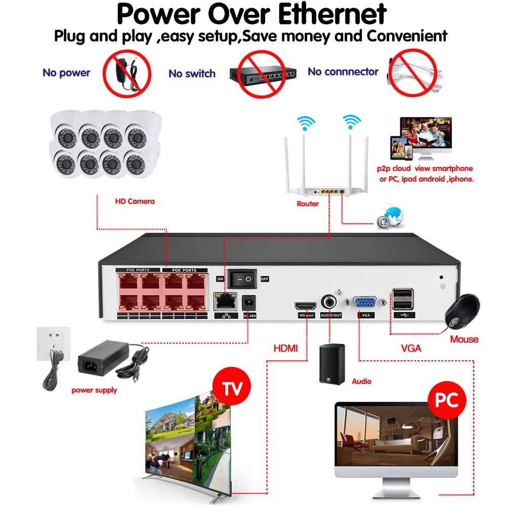 8CH 5MP POE 48V Real NVR kit 1080P HD Vandalproof Dome camera 2MP POE IP Camera IR 30M POE CCTV Cam