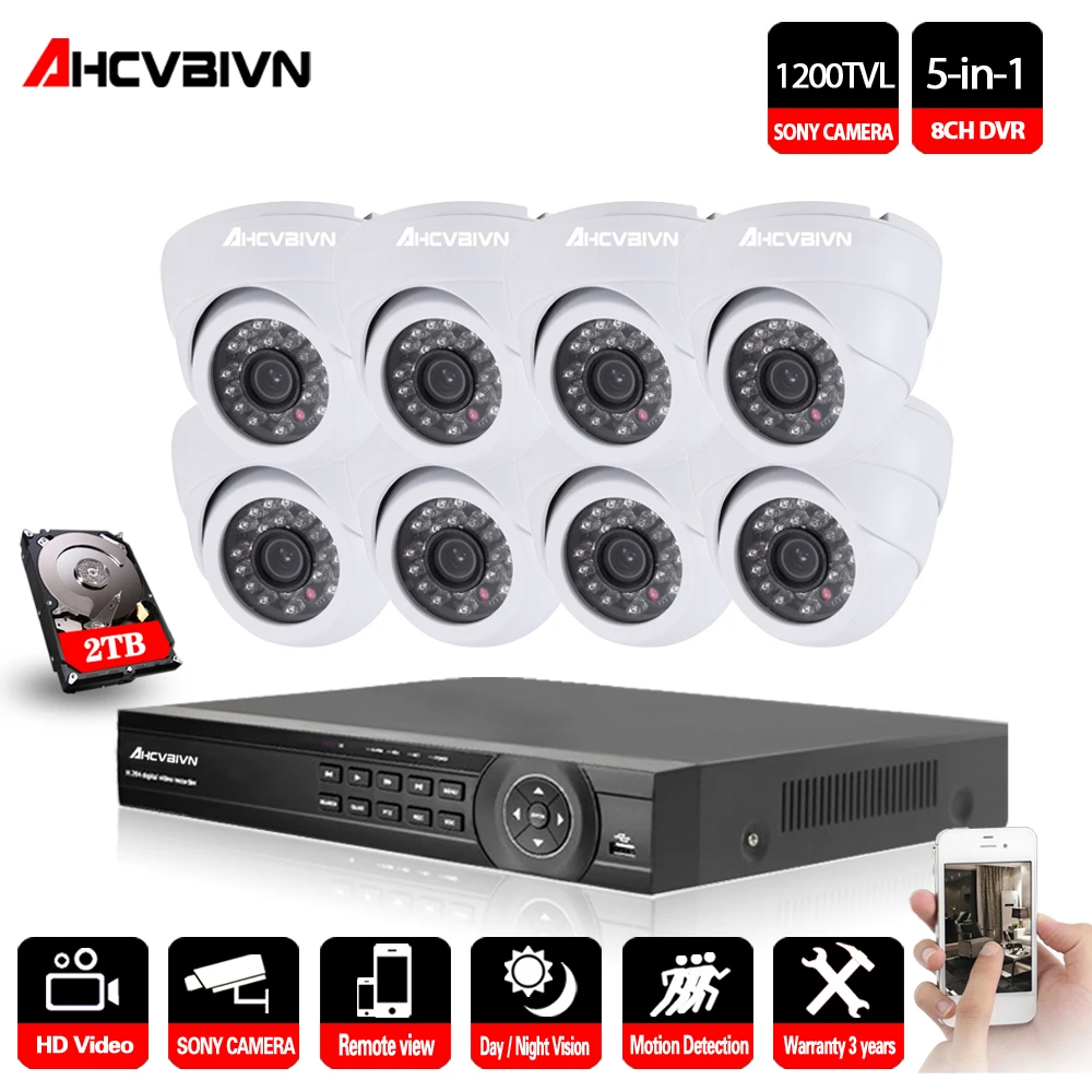 AHCVBIVN Video Surveillance System 8CH CCTV Security Kit 8PCS 1200TVL Dome Security Camera Night Vi